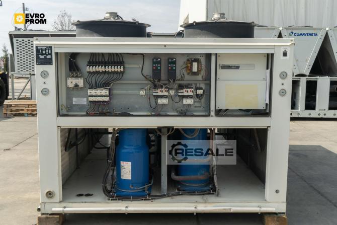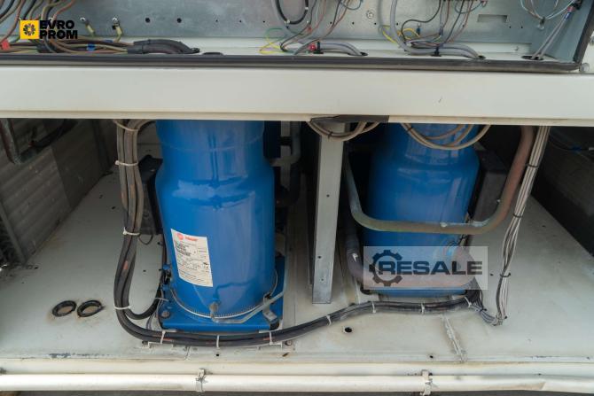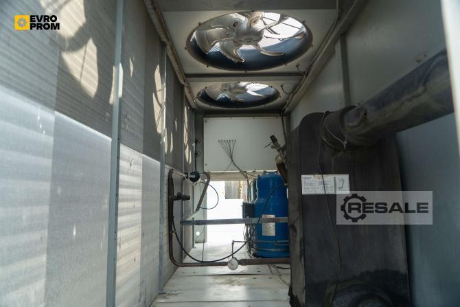 Hava soğutmalı soğutucu TRANE 161 KW ECGAN600 Soğutma kapasitesi: 161 kW / 45,78 ton (12/7 — 35°C) Üretim yılı: 2011 Soğutucu devirsi: 2 pc. Isı değiştiricisi: Plaka Kondansatör: Bakır / Alüminyum Kompresörler: 4 pc. Danfoss CSHA150KE (kaydırma) Soğutucu türü: R407с Fan ...